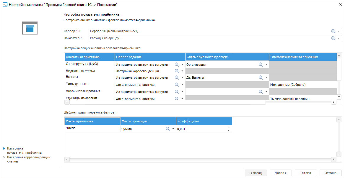 Рассмотрим пример создания правила маппинга для загрузки фактического показателя «Расходы на аренду».