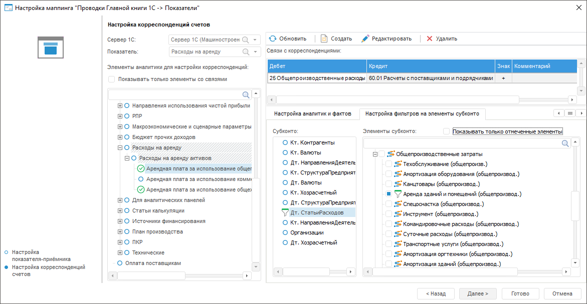 маппинга «Проводки Главной книги 1С -> Показатели»