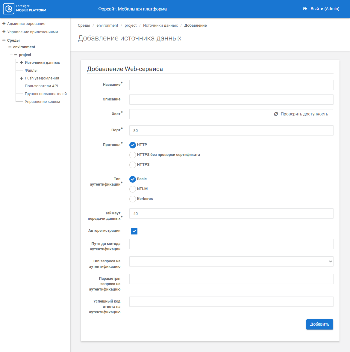 Хост. Укажите IP-адрес или DNS-имя источника данных без указания протокола. Для проверки подключения нажмите кнопку «Проверить доступность». При положительном ответе отобразится зеленая кнопка «Ответ получен», при отрицательном ответе красная кнопка «Недоступен». Если хост недоступен, проверьте подключение к сети Интернет или настройки подключения к источнику данных по указанному хосту. Поле обязательно для заполнения;