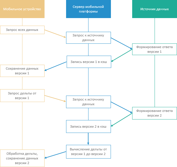 Дельта передается мобильному устройству с сервера мобильной платформы.