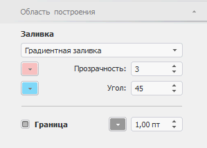 §  Сплошная заливка. Используется заливка области построения одним цветом. Выберите цвет из раскрывающейся палитры. В числовом редакторе «Прозрачность» установите значение прозрачности для заливки;