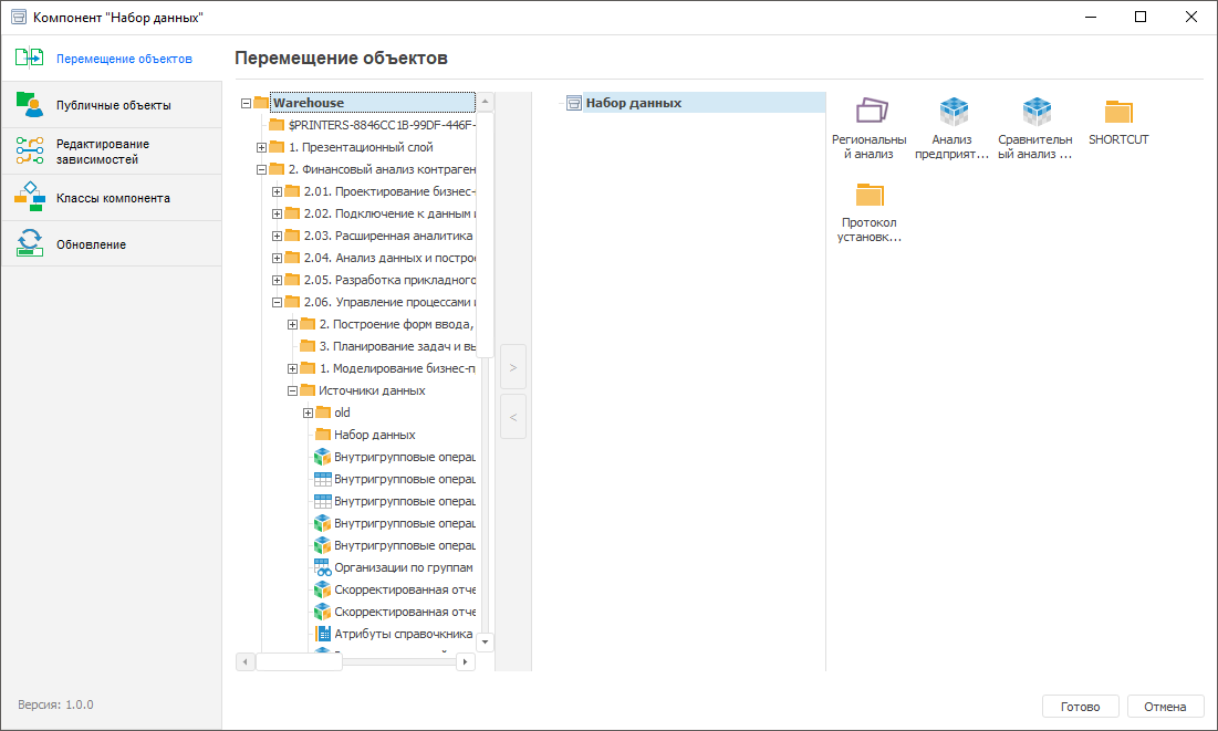 Примечание. Для переноса многофункциональных объектов, например, аналитических панелей, экспресс-отчётов и других, перенесите во внутреннюю структуру компонента все используемые в них источники и объекты.