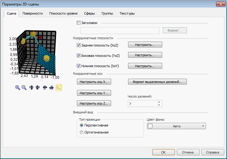 Поверхности. Определяет настройки для поверхностей трехмерной сцены;