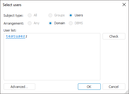 For details about how to work with dialogs of domain user selection, go to the Selecting Users and Groups section.