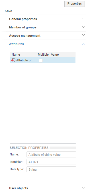 To add or edit value to added attributes of users, use the Attributes tab in the User Properties dialog box of the desktop application and on the Properties side panel of the web application: