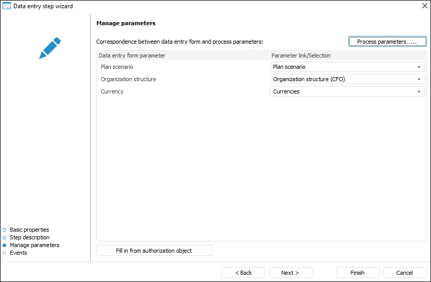 Data entry form and process parameters must be linked to open data entry form with the same parameters as the process step started for execution. Determine Correspondence Between Data Entry Form and Process Parameters on the Manage Parameters page: