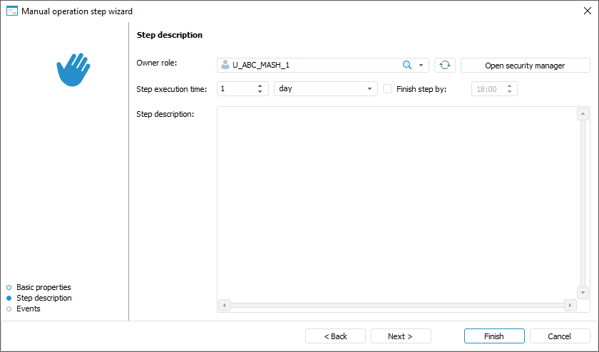 The Manual Operation Step is used to describe tasks that are executed by user without any automated execution operation.For example, the contract signature or discharge of goods.To create the step, open manual operation wizard.