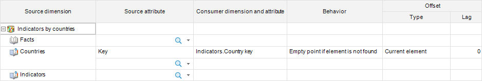 For example, the data consumer contains the Indicators dimension and the data source contains the Countries dimension. The dimensions contain the following data and the following selection: