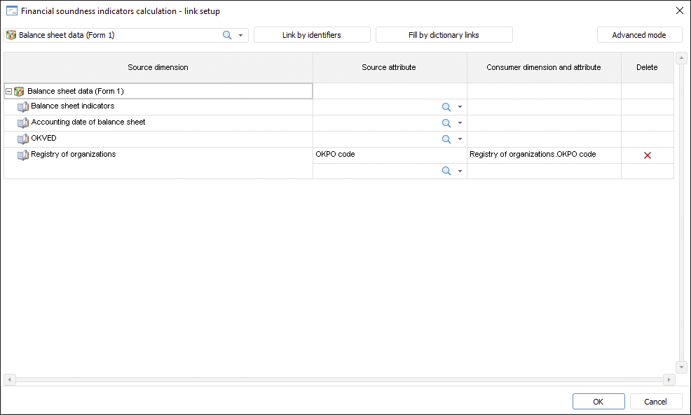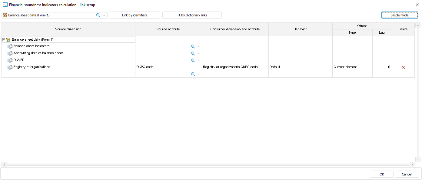 To set up links between data source and data consumer dimensions, use the Set Up Links dialog box. A link can be set up in various modes: simple and advanced. The dialog box look differs depending on the setup mode: