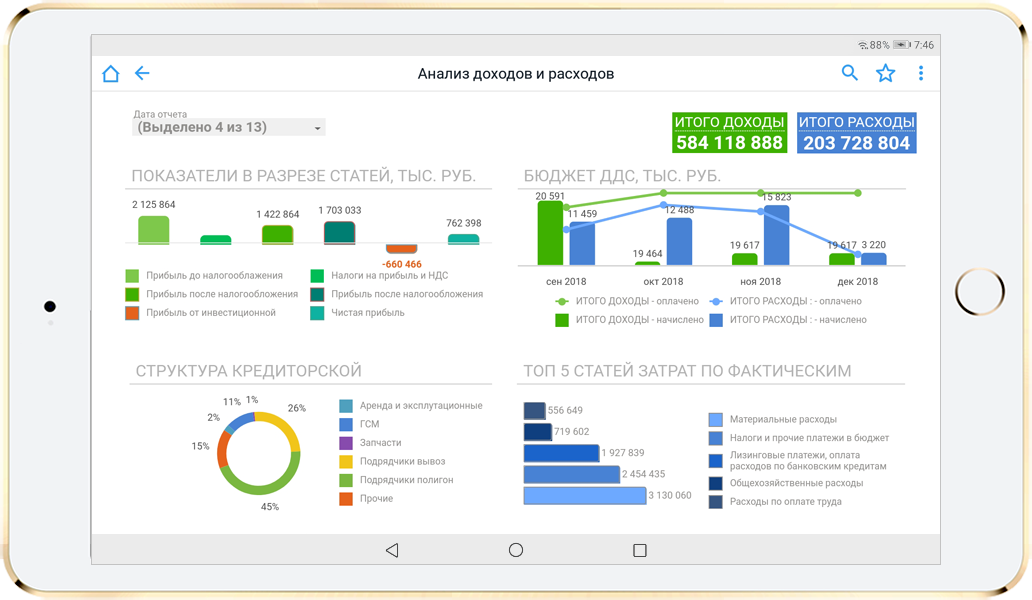 Dashboard, built using the Dashboard tools in the desktop or web application, enables viewing generated analytical documents as a combination of interactive interrelated visualizers.