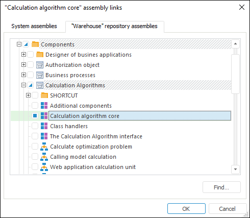 In the development environment add links to the Algo system assembly and to the Calculation Algorithm Core custom assembly, which is included in the Calculation Algorithms component: