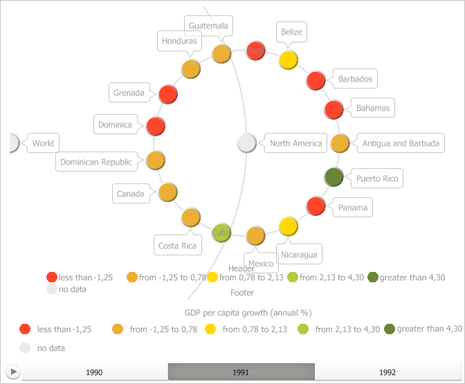 Before executing this example, the bubble tree looks as shown on the IVZBubbleTree interface description page. Then create a legend with intervals, that does not reduce bubble tree workspace. Select values of appropriate properties of color legend for all required properties of bubble tree workspace, set title and footer. Then add the legend to the bubble chart: