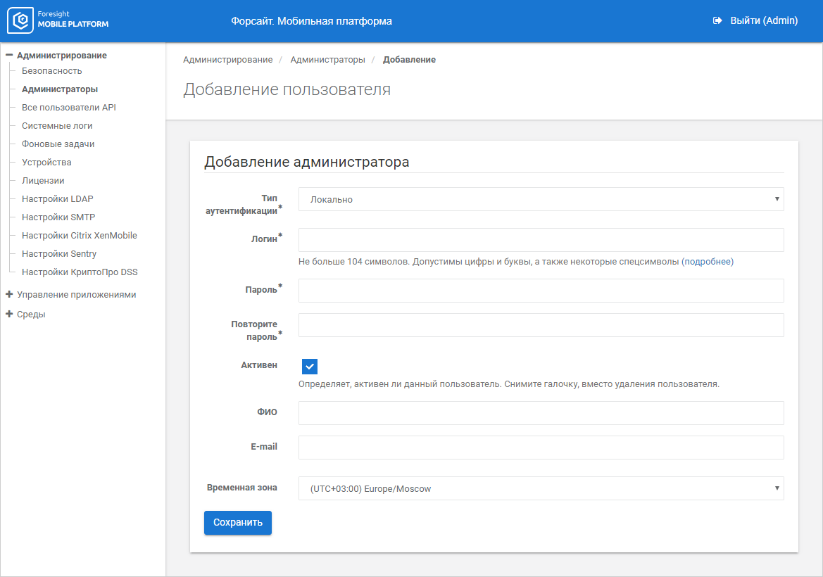 NOTE. Administrator accounts can be changed only by the administrator with full access to the Administration section.