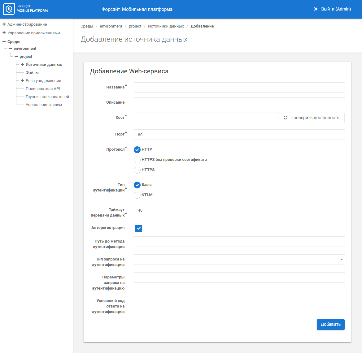 NOTE. Default anonymous credentials are automatically added for JSON, WEB, Foresight Web data sources on the Credentials tab after the connection is set up. Credentials for Exchange data source can be added only after the connection is set up.