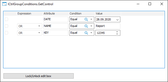 To execute an example, create a form given in the example for the ICtrlGroupConditions.AddRow method. Add the Button component named Button1 on the form and set the Text property to Unlock/Lock Edit Box.