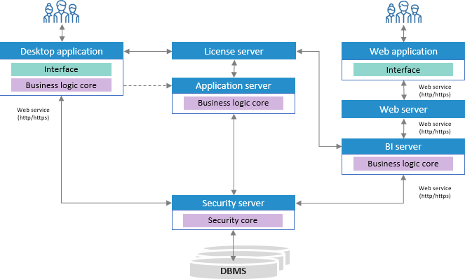Foresight Analytics Platform desktop application connects via web service to the security server and passes identifier of the required repository set up in the security server. Then all requests from Foresight Analytics Platform desktop application to database pass via the security server that forms database requests. On using the web application the BI server used as a business logic core is added to configuration.