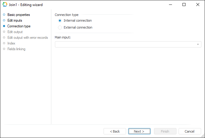 External Connection. The consumer gets all records from the provider specified in the Main Input field, data from other providers supplement them. Provider objects are linked by a specified index.