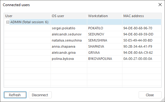 After executing the operation, the Connected Users dialog box opens: