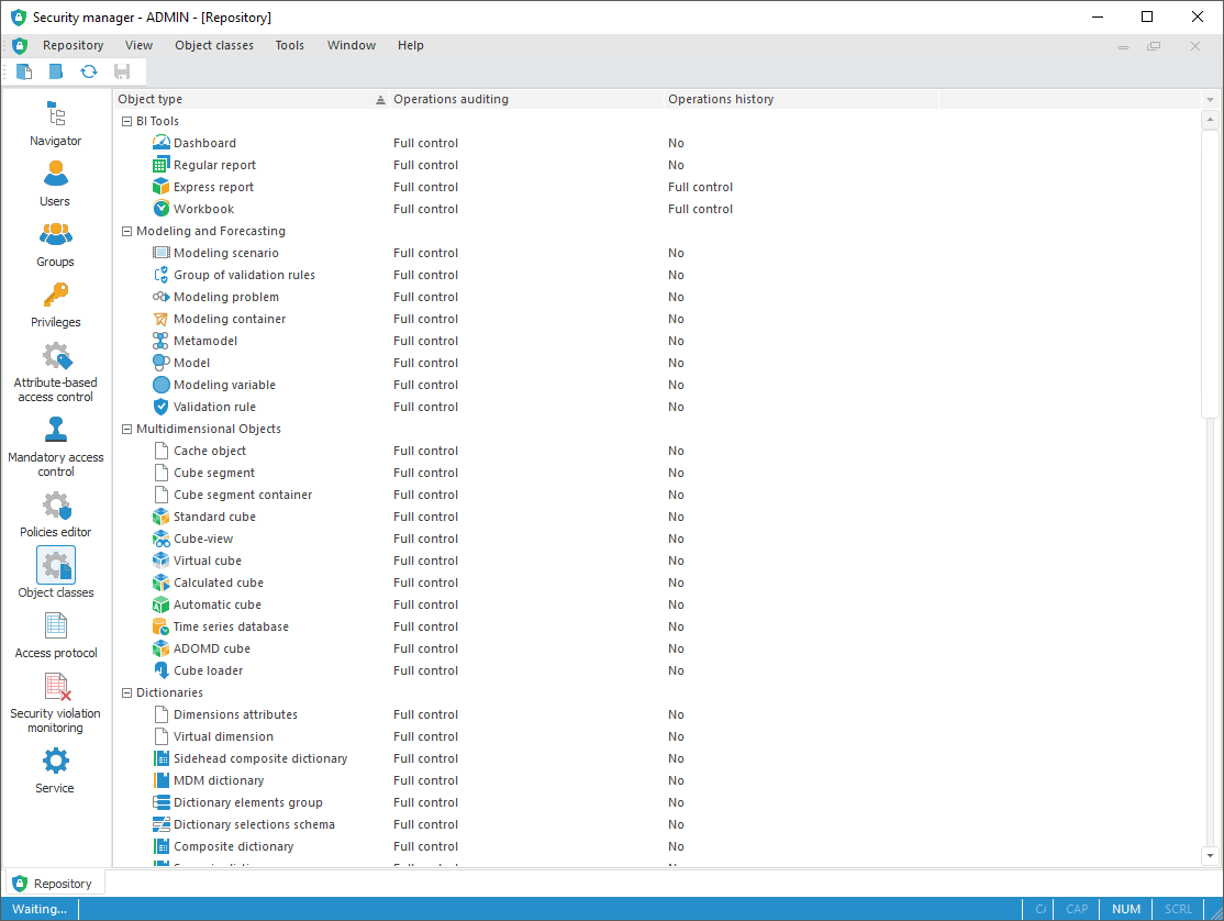 The security manager can automatically audit operations executed by system subjects and record information about the executed operations to the access protocol. The logged operations are divided into general that can be executed with all object types, and specific that can be executed only with specific object type. Operation history can be maintained for each object type: object changes, permission changes, object deletion. If full history is maintained, object changes by all operations are saved to history.