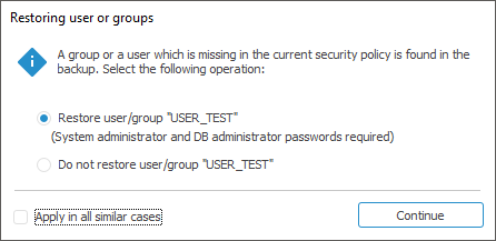 Select the Restore option, after click the Continue button. Upon restoring the user or the group the system requests password of the system administrator or database server administrator.