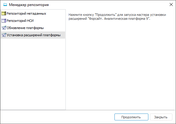 Primary installation of Designer of Business Applications extension of Foresight Analytics Platform to development repository using repository manager. After the extension has been installed, the Designer of Business Application system component with the COMP_CONSTRUCT identifier will be installed to repository.