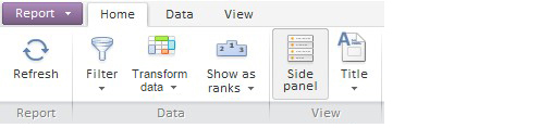 // Get an object of the express report tool ribbon var ribbon = expressBox.getRibbonView(); // Show the Chart tab ribbon.getChartCategory().show(); // Show the Table tab ribbon.getTableCategory().show(); // Show the Title tab ribbon.getTitleCategory().show(); // Hide the Home tab ribbon.getMainCategory().hide(); // Hide the Data tab ribbon.getDataRibbonCategory().hide(); // Hide the View tab ribbon.getViewRibbonCategory().hide();