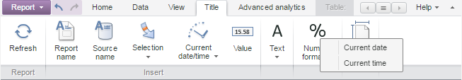 Executing the example requires that the HTML page contains the ExpressBox component named expressBox (see Example of Creating the ExpressBox Component). To display the Title tab, click the Title button on the Home tab. Display menu of the Current Date/Time button of the Title tool ribbon tab: