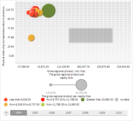 Move the mouse cursor to the center of bubble chart rendering area and hold down the left mouse key. Hold down the button and drag the cursor to the bottom right corner of bubble chart rendering area. As a result, bubble chart selection frame is displayed with its width three times larger than its height: