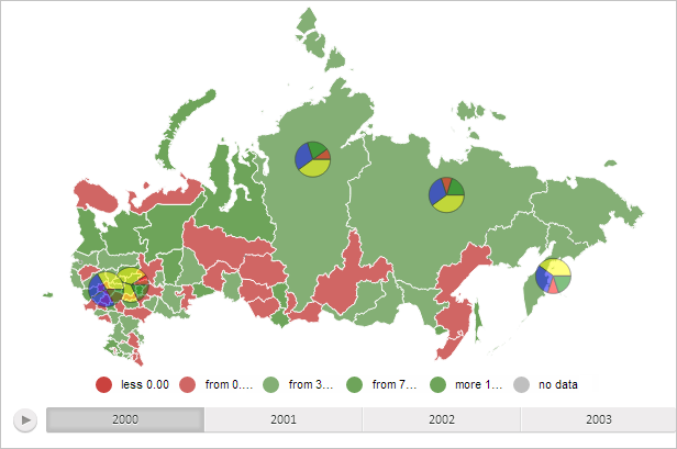 To execute the example the HTML page must contain the MapChart component named map (see Example of Creating the MapChart Component). Show all available pie factors in the map and set 50% transparency for these factors: