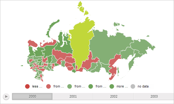 To execute the example the HTML page must contain the MapChart component named map (see Example of Creating the MapChart Component). For the map layer area with the RU-KYA identifier play half of the animation process that consists of changing the starting yellow fill color to initial green: