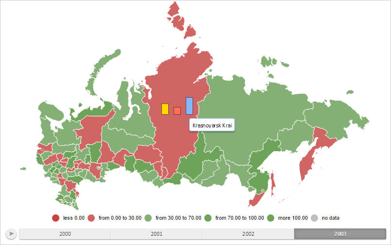 To execute the example the HTML page must contain the MapChart component named map (see Example of Creating the MapChart Component). Add a new visual item to the map - the bar factor for the map layer area with the RU-KYA identifier and a tooltip:
