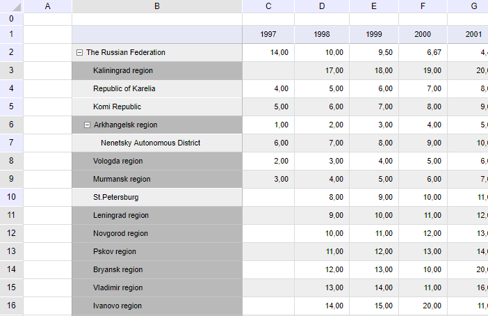 To execute the example, the HTML page must contain the GridBox component named grid (see Example of Placing the GridBox Component). Find cells with the "region" word in the table and highlight them: