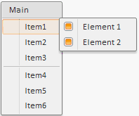 The menu consists of the Main title, the separator (between the third and the fourth items) and six items. First three items are the instances of the MenuItem class, fourth is the text, fifth is the HTML layout, sixth is the DOM node.
