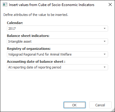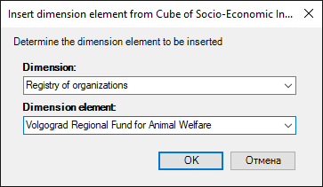 In the Insert Dimension Element From <Source Name> dialog box select dimension and dimension element in the corresponding boxes and click the OK button: