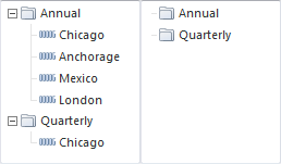 The MetaAttributesTreeList component example with the set value of the ShowLeafFactors property - True (to the left) and False (to the right):