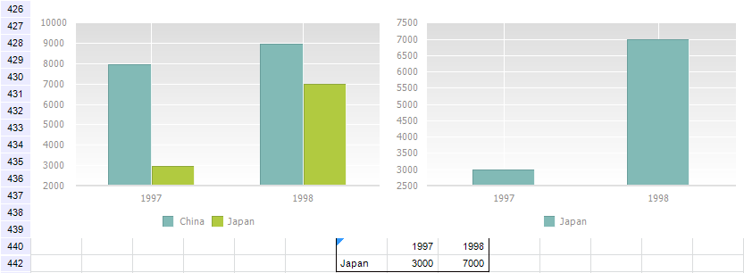 Below is a data area with partially hidden rows. See below examples of a chart for this data area with the IncludeHidden property = True (left) and IncludeHidden = False (right):