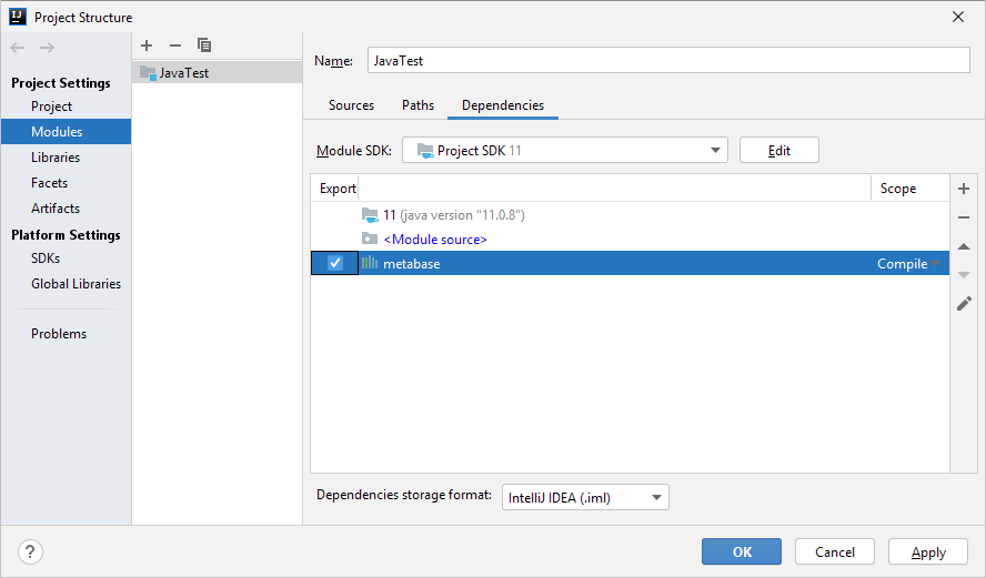 To connect an external assembly, enter the structure of the Java project to be developed, go to the Modules tab, click the