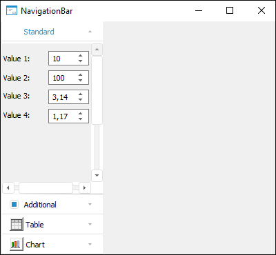 The NavigationBar1 tab collection is set up at the form startup. Four tabs are created in the collection, and the header and the panel are set up for each of them. The ImageButton components are displayed in the titles for the last two tabs. The first tab is active. Component borders are also changed.