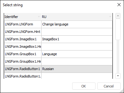 The dialog box shows all row elements of the resources connected to the form. Identifier and default language values are displayed for each resources' element. After selecting a new row element click the OK button.
