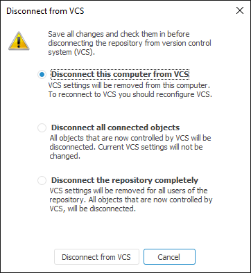 IMPORTANT. Total repository disconnection from version control system will result in deleting all settings for users working in this repository.