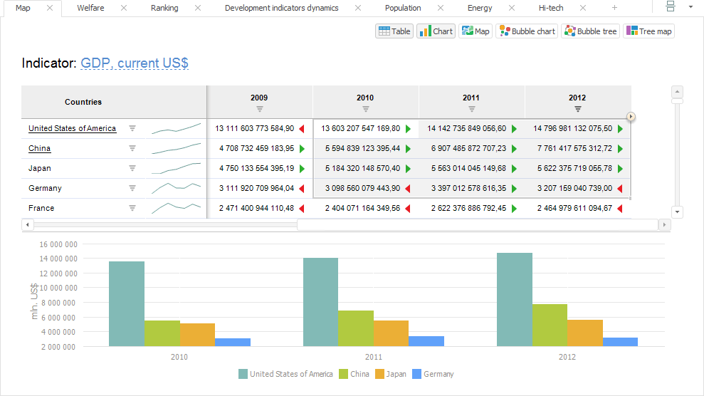 Analytical queries (OLAP) enable the user to quickly create reports allowing to analyze arbitrary data dimensions by means of visualizers.