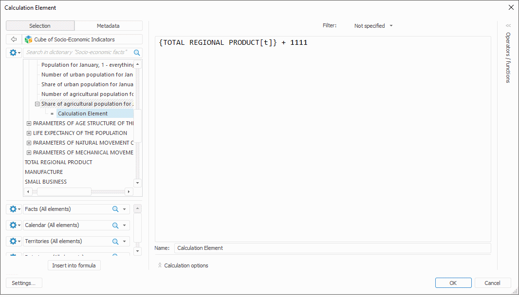 After clicking the Button2 button a dialog box of expression editor for regular report calculated element opens, which contains the element formula that can be edited: