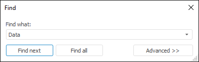 Find Next. The first found element gets focus. Clicking this button again moves the focus to the next found element and so on. An information message is displayed when the dictionary reaches the end.