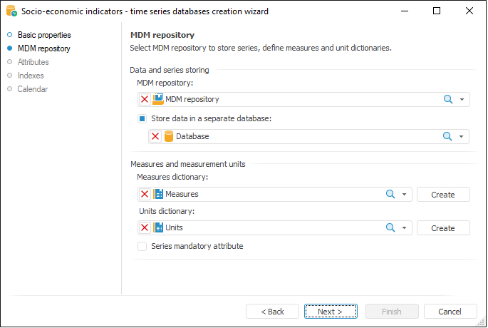 NOTE. The measurement units recalculation will be unavailable, if the Series mandatory attribute checkbox is selected on the MDM Repository page in time series database wizard page. Units dictionary is presented as a separate dimension without automatic scaling of data to all measurement units.