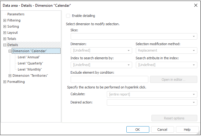 To reset detailing settings for the selected dimension or level, click the Reset Options button.