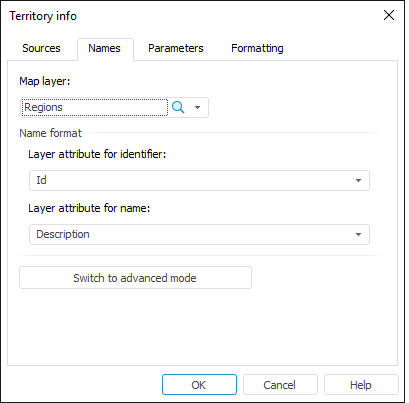The advanced mode shows the Names tab of the Territory Info dialog box in the following way: