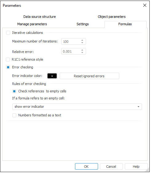 Error Checking Options. The command opens the Report Parameters dialog box on the Formulas tab.