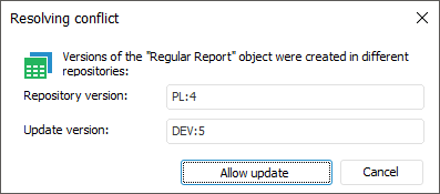 Corresponding object is controlled by VCS. The conflict occurs if the update contains objects added to version control system. To resolve the conflict, click the hyperlink in the Conflict box and confirm the update: