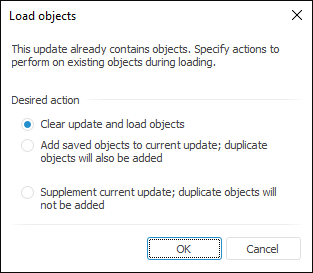 If the update panel already contains some objects, the user needs to specify operations with existing objects in the Load Objects dialog box on opening an update: