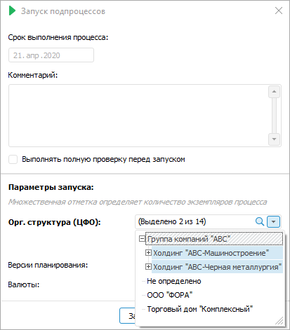 При выполнении шага в ручном режиме будет открыто окно «Запуск подпроцессов», где параметрами запуска являются значения, соответствующие условиям фильтрации: